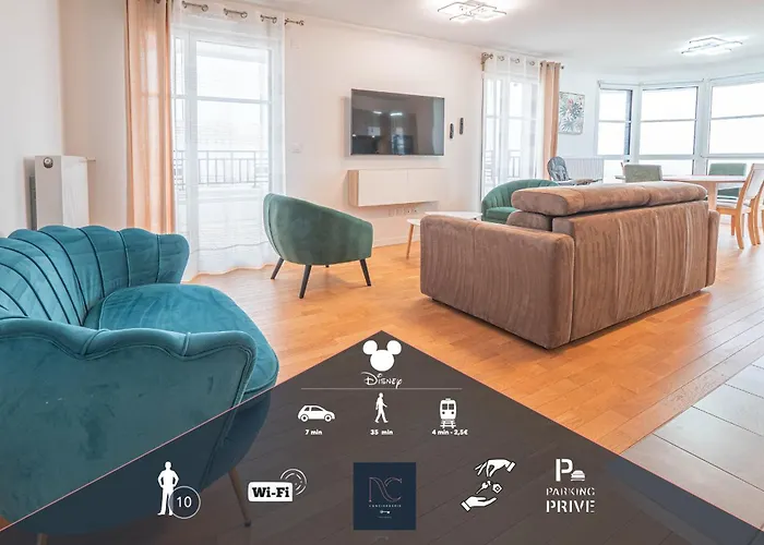 Disneyland-Paris 10 Personnes, Wifi, 2 Parkings appartement ligt binnen 10 minuten rijden van Disneyland Parijs en heeft gratis priveparkeerplaatsen voor degenen die met de auto reizen. Het Val d'Europe winkelcentrum ligt op geringe afstand van deze 77 m^2 grote accommodatie.